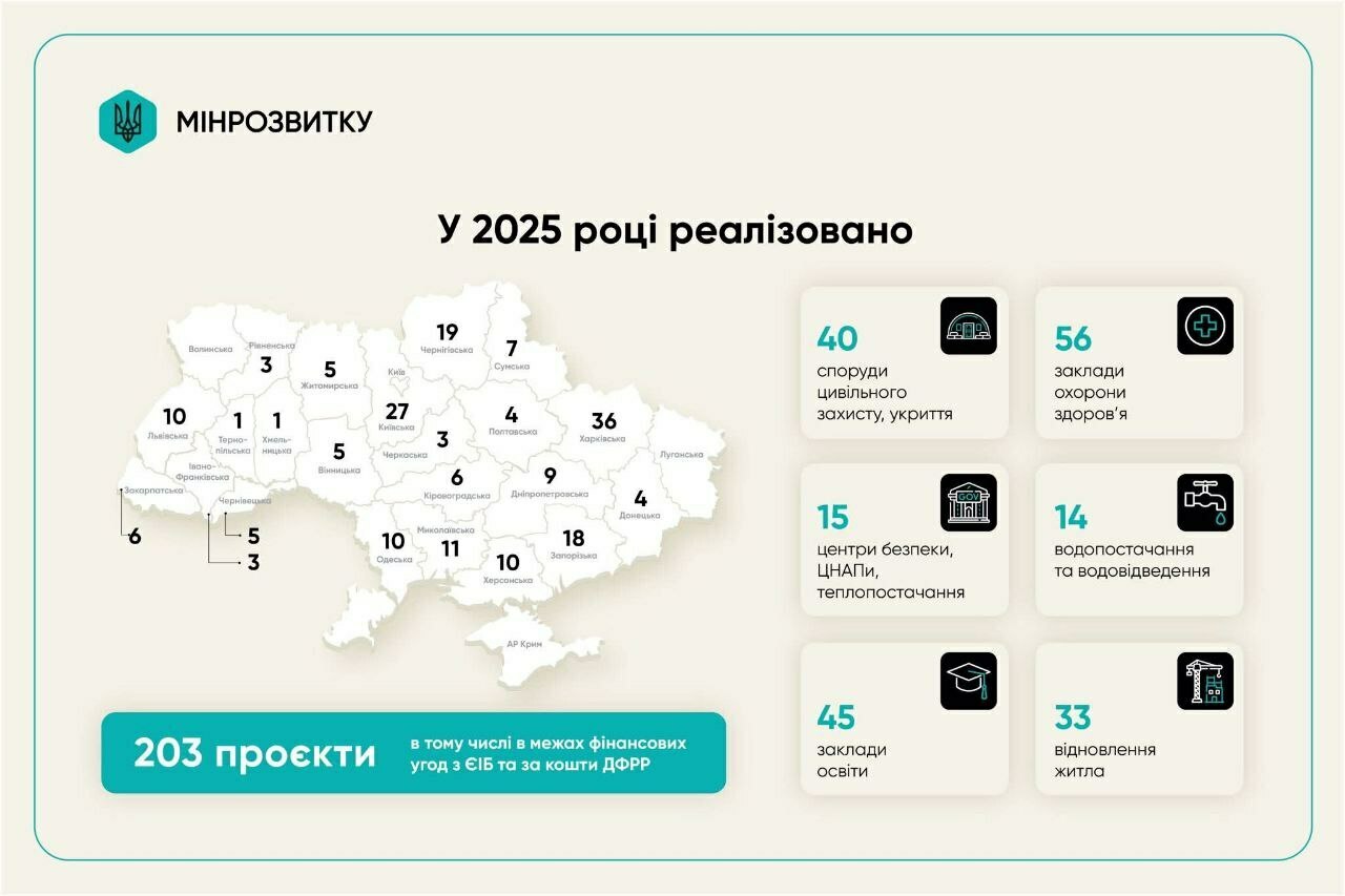 До кінця 2025 року в громадах по всій країні буде завершено 203 проєкти розвитку та відновлення. Про це повідомив заступник Міністра розвитку громад та територій України Олексій Рябикін.