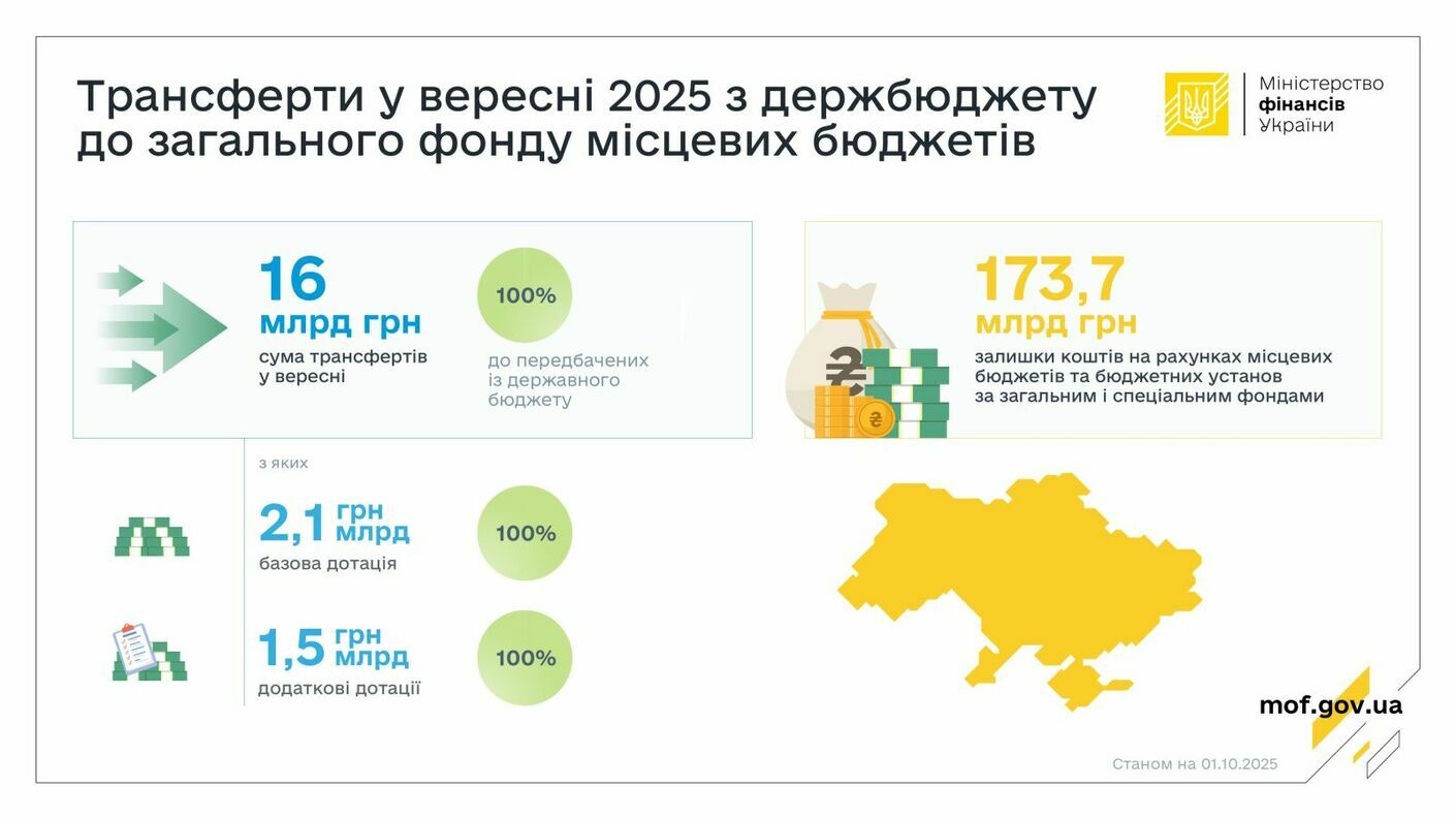 У вересні 2025 року Міністерство фінансів України у повному обсязі забезпечило перерахування міжбюджетних трансфертів до загального фонду місцевих бюджетів. Загалом надійшло 16 млрд гривень, що становить 100% передбачених Державним бюджетом коштів на цей місяць.
