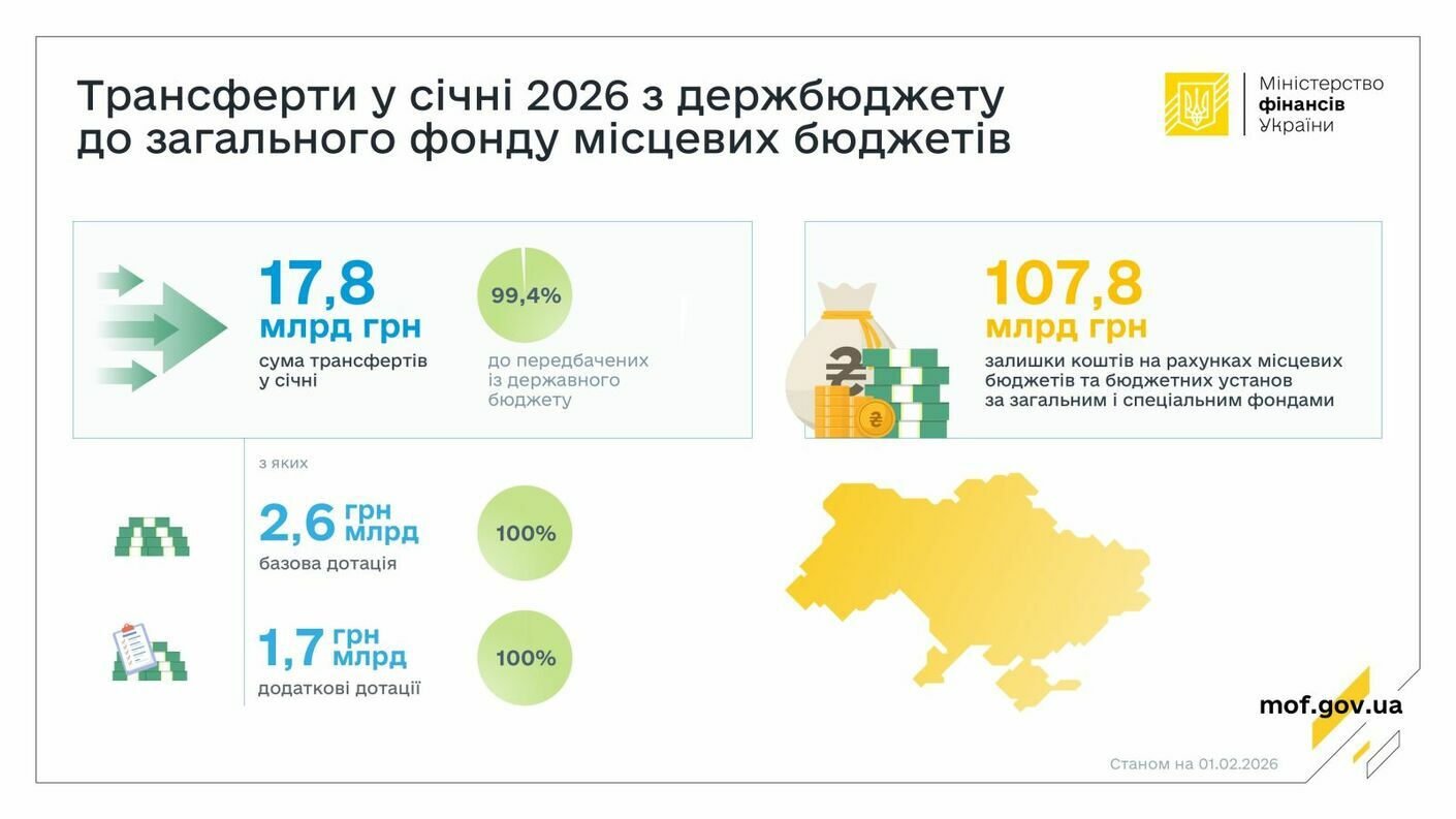 У січні 2026 року Міністерство фінансів України, відповідно до вимог бюджетного законодавства, забезпечило перерахування міжбюджетних трансфертів до загального фонду місцевих бюджетів у сумі 17,8 млрд грн, що становить 99,4% від передбаченого державним бюджетом обсягу фінансування на січень.