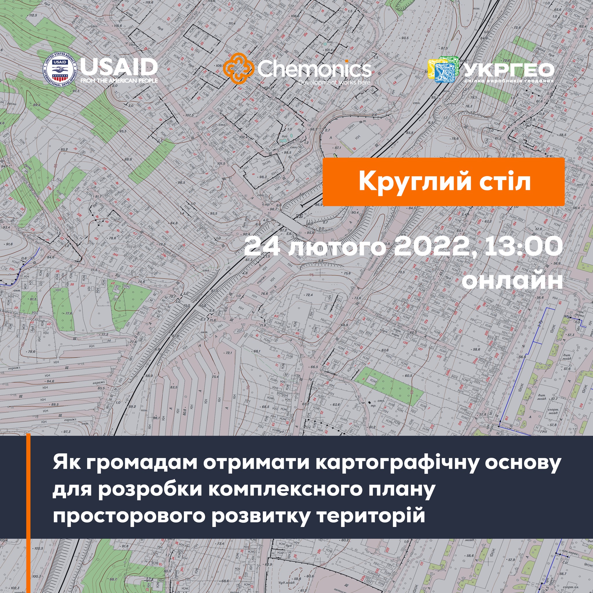 24 лютого о 13:00 у онлайн-форматі розпочнеться круглий стіл «Як громадам отримати картографічну основу для розробки комплексного плану просторового розвитку територій». Захід відбудеться в межах проєкту Підтримка громад в управлінні землями. Організатор – ГС УкрГео та Держгеокадастр за підтримки Програми USAID з аграрного і сільського розвитку - АГРО.