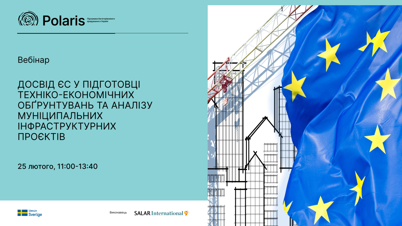 25 лютого 2026 року о 11:00–13:40 шведсько-українська Програма Polaris «Підтримка багаторівневого врядування в Україні» проводить вебінар «Досвід ЄС у підготовці техніко-економічних обґрунтувань та аналізу витрат і вигод для муніципальних інфраструктурних проєктів».